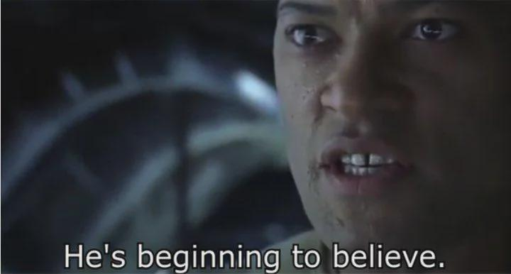 But to take a example from the 1st Matrix movie. (what is a Plato’s cave allegory with those strange figures inside the cave carrying around figures in front of a flame.). Neo is told he is the one. but he doesn’t believe it. The oracle could tell him that he was the one. But she didn’t. Believing is a force coming from within. Like any golden object it’s a motion from the bottom back to the top.